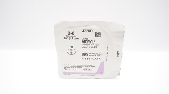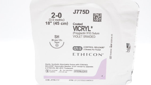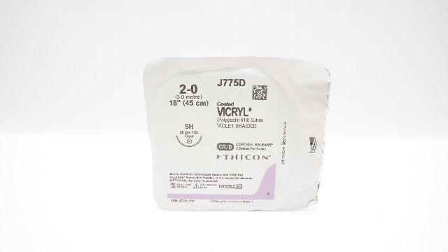 Ethicon J775D 2-0 Coated VICRYL (Polyglactin 910) Suture Violet Braided SH 26mm 1/2c Taper 18inch