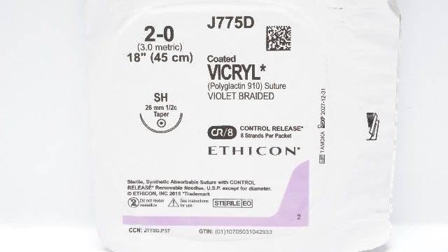 - Ethicon J775D 2-0 Coated VICRYL (Polyglactin 910) Stre SH 26mm 1/2c Taper 18inch