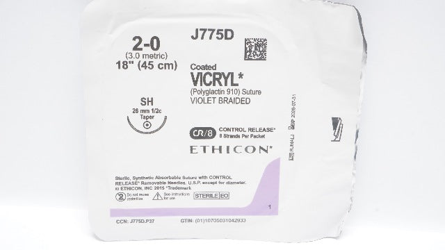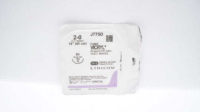 Ethicon J775D 2-0 Coated VICRYL (Polyglactin 910) Suture Violet Braided SH 26mm 1/2c Taper 18inch