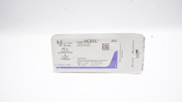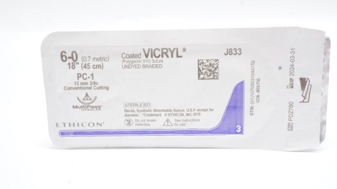 Ethicon J833 6-0 Coated Vicryl Polyglactin 910 Suture Undyed Braided PC-1 13mm 3/8c 18 inch