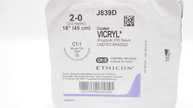- Ethicon J839D 2-0 VICRYL, CT-1, 36mm 1/2c Taper, 18inch (x)
