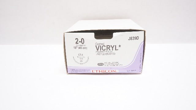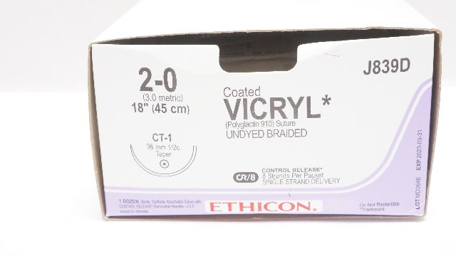 - Ethicon J839D 2-0 VICRYL Stre CT-1 36mm 1/2c Taper 18 inch (x) - Box of 12