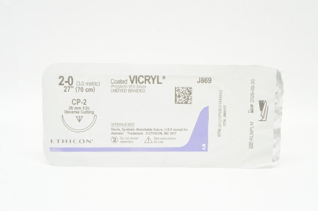 Ethicon J869 2-0 Coated Vicryl Polyglactin 910 Stre Undyed Braided CP-2 26mm 1/2c Reverse Cutting 27in.