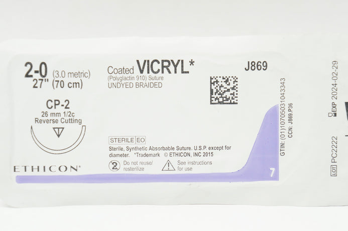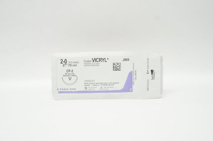 - Ethicon J869 2-0 Coated VICRYL, CP-2, 26mm 1/2c Reverse Cutting, 27inch