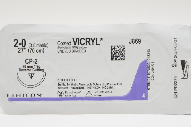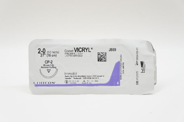 - Ethicon J869 2-0 VICRYL, CP-2, 26mm 1/2c Reverse Cutting, 27inch