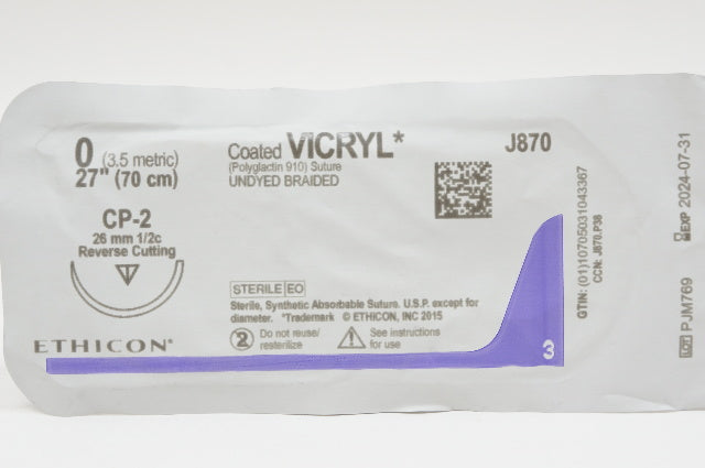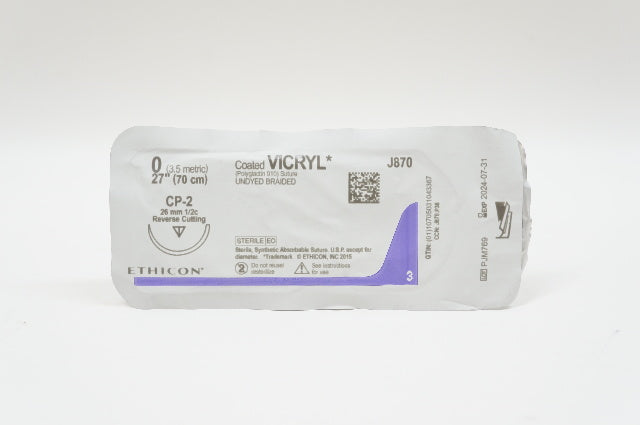 Ethicon J870 0 VICRYL, CP-2, 26mm 1/2c Reverse Cutting, 27inch