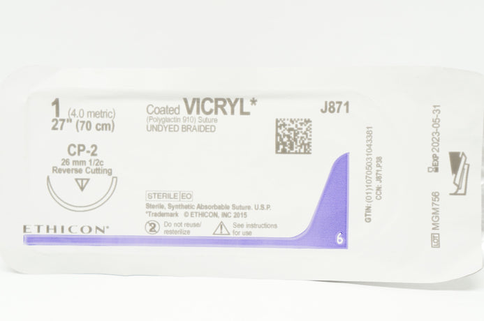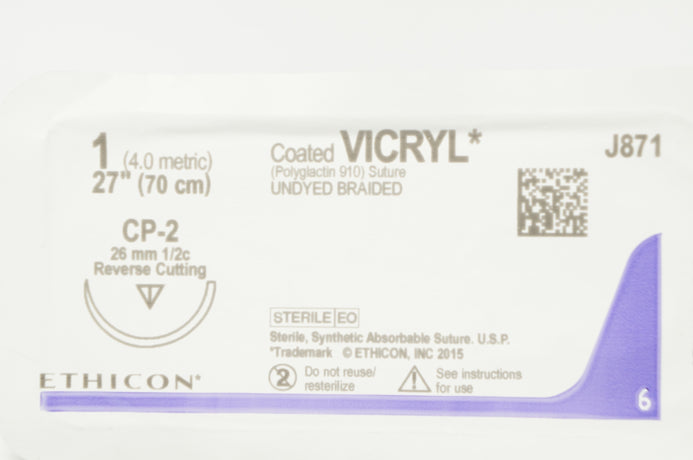 - Ethicon J871 1 Coated VICRYL, CP-2 26mm 1/2c Reverse Cutting, 27in