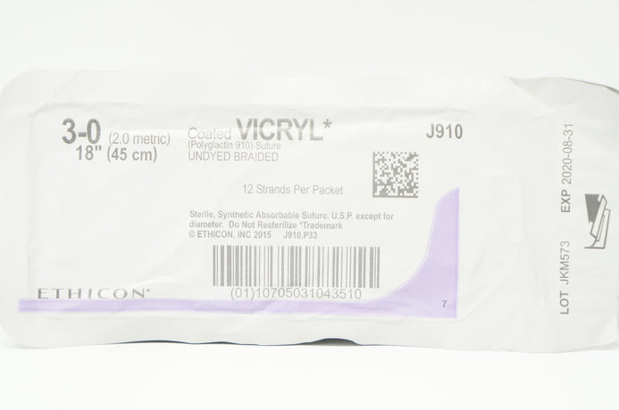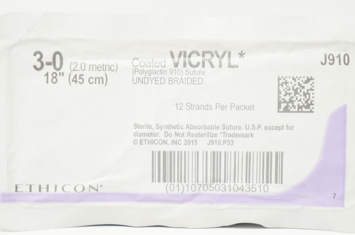 - Ethicon J910 3-0 Coated VICRYL Polyglactin 910 Stre Undyed Braided 18inch (x)