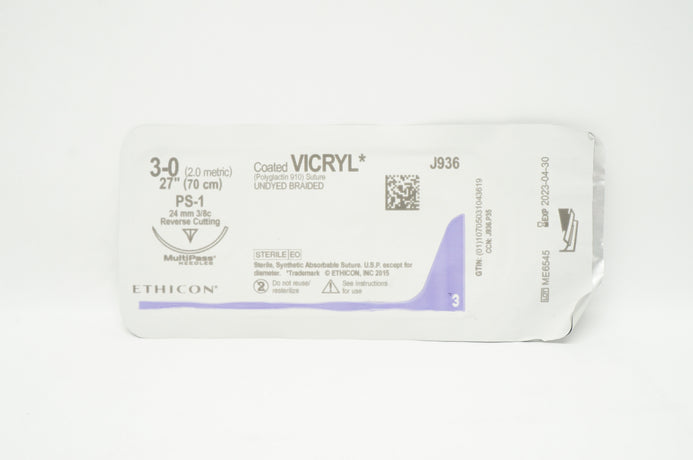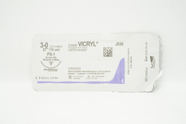 - Ethicon J936 3-0 VICRYL Polyglactin Stre PS-1 24mm 3/8c Reverse Cutting 27inch(x)