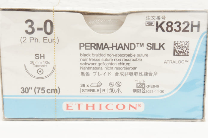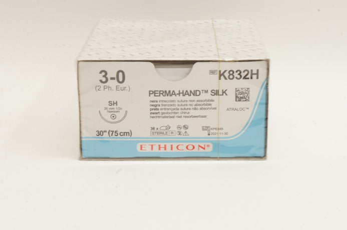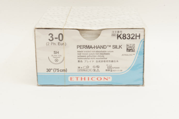 - Ethicon K832H 3-0 Perma-Hand Silk Stre SH 26mm 1/2c, 30inch - Box of 36