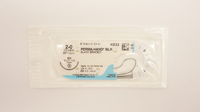 - Ethicon K833 2-0 Perma-Hand Silk Black Braided SH 26mm 1/2c Taper, 30inch (x)