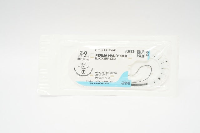 Ethicon K833 2-0 Perma-Hand Silk Black Braided Stre SH 26mm 1/2c Taper, 30in