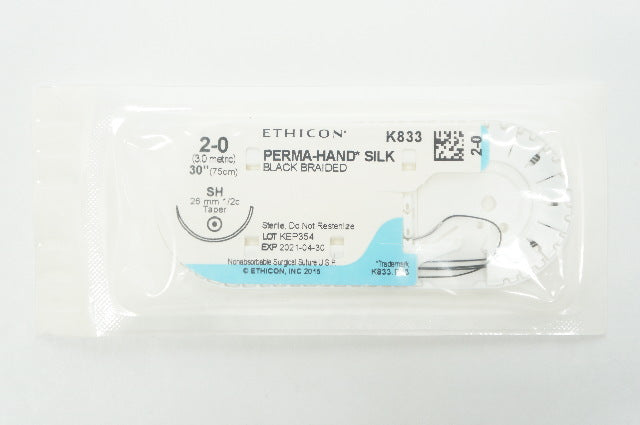 - Ethicon K833 2-0 PERMA-HAND SILK Stre SH 26mm 1/2c Taper, 30inch