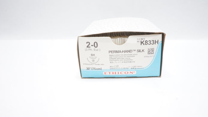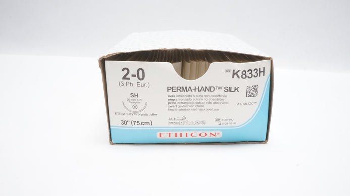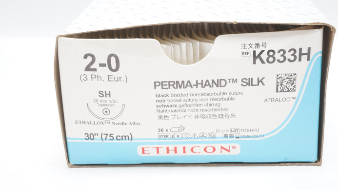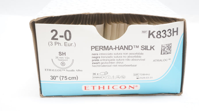 - Ethicon K833H 2-0 PERMA-HAND SILK Stre, SH,26mm 1/2c Taper,30in. - Box of 36