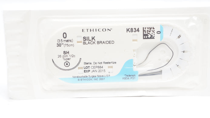 Ethicon K834 0 Perma-Hand Silk Stre Black Braided SH 26mm 1/2c Taper, 30inch (x)
