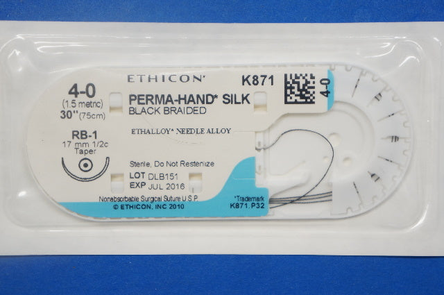 - Ethicon K871 4-0 PERMA-HAND SILK, RB-1 17mm 1/2c Taper, Black Braided, 30