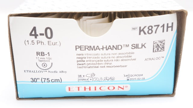 Ethicon K871H 4-0 Perma-Hand Stre RB-1 17mm 1/2c Taperpoint 30inch -Box of 30