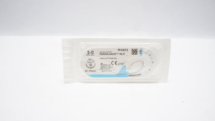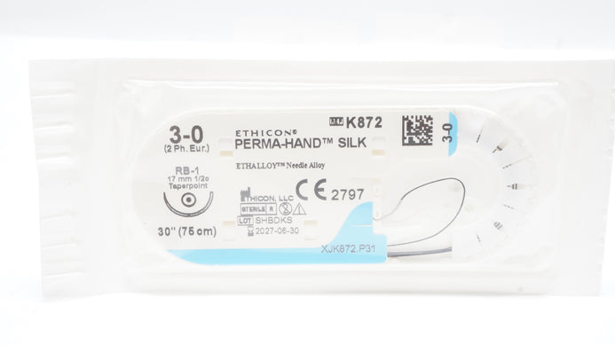 Ethicon K872 3-0 Perma-Hand Silk Black Braided Suture RB-1 17mm 1/2c Taperpoint 30inch