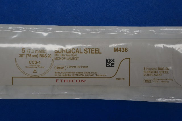 Ethicon M436G Surgical Stainless Steel Suture, Conventional Cutting - Sternum, CCS-1, 2-30", Size 5