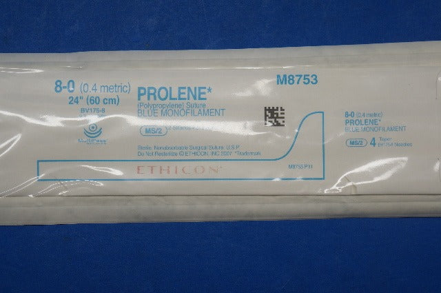 - Ethicon M8753 8-0 PROLENE, BV175-8 9.3mm 3/8c Taper, Blue Monofilament, 24