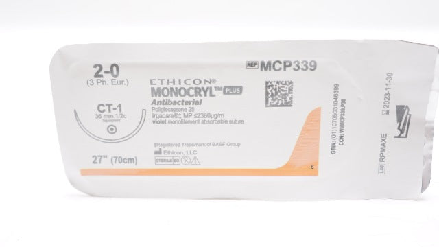 - Ethicon MCP339 2-0 MONOCRYL Plus, CT-1, 36mm 1/2c Taper, 27inch (x)
