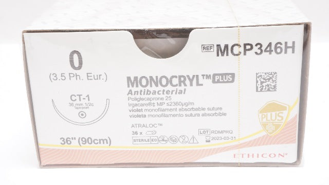 - Ethicon MCP346H 0 Monocryl Plus Antibacterial CT-1 36inch 36mm 1/2c(x)-Box of 36