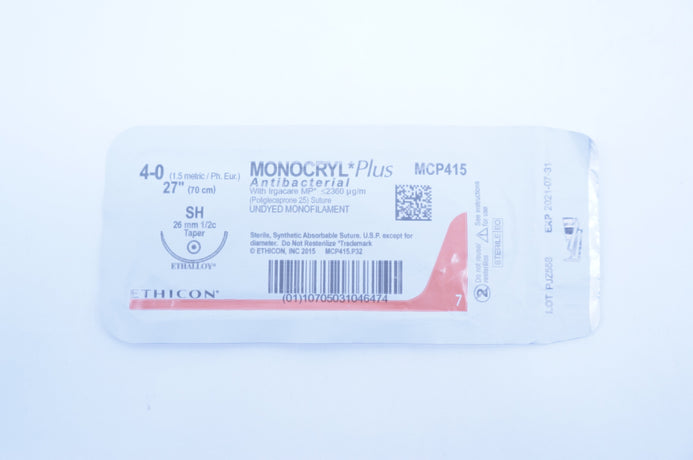 - Ethicon MCP415 4-0 MONOCRYL Plus, SH, 26mm 1/2c Taper, 27inch
