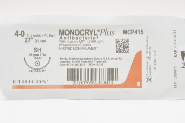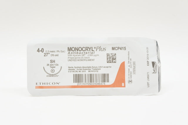 - Ethicon MCP415 4-0 MONOCRYL Plus, SH, 26mm 1/2c Taper, 27inch (x)