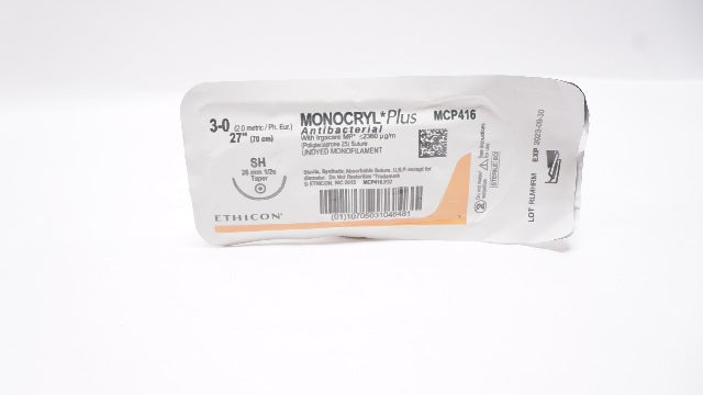 Ethicon MCP416 3-0 MONOCRYL Plus Antibacterial Stre SH 26mm 1/2c Taper, 27inch