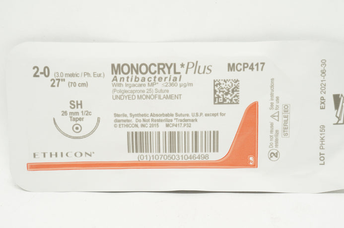 Ethicon MCP417 2-0 MONOCRYL Plus Antibacterial with IrgacareMP ≤2360µg/m Poliglecaprone 25 Suture Undyed Monofilament SH 26mm 1/2c Taper 27inch