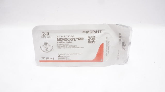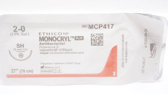 - Ethicon MCP417 2-0 MONOCRYL Plus, SH, 26mm 1/2c Taper, 27inch