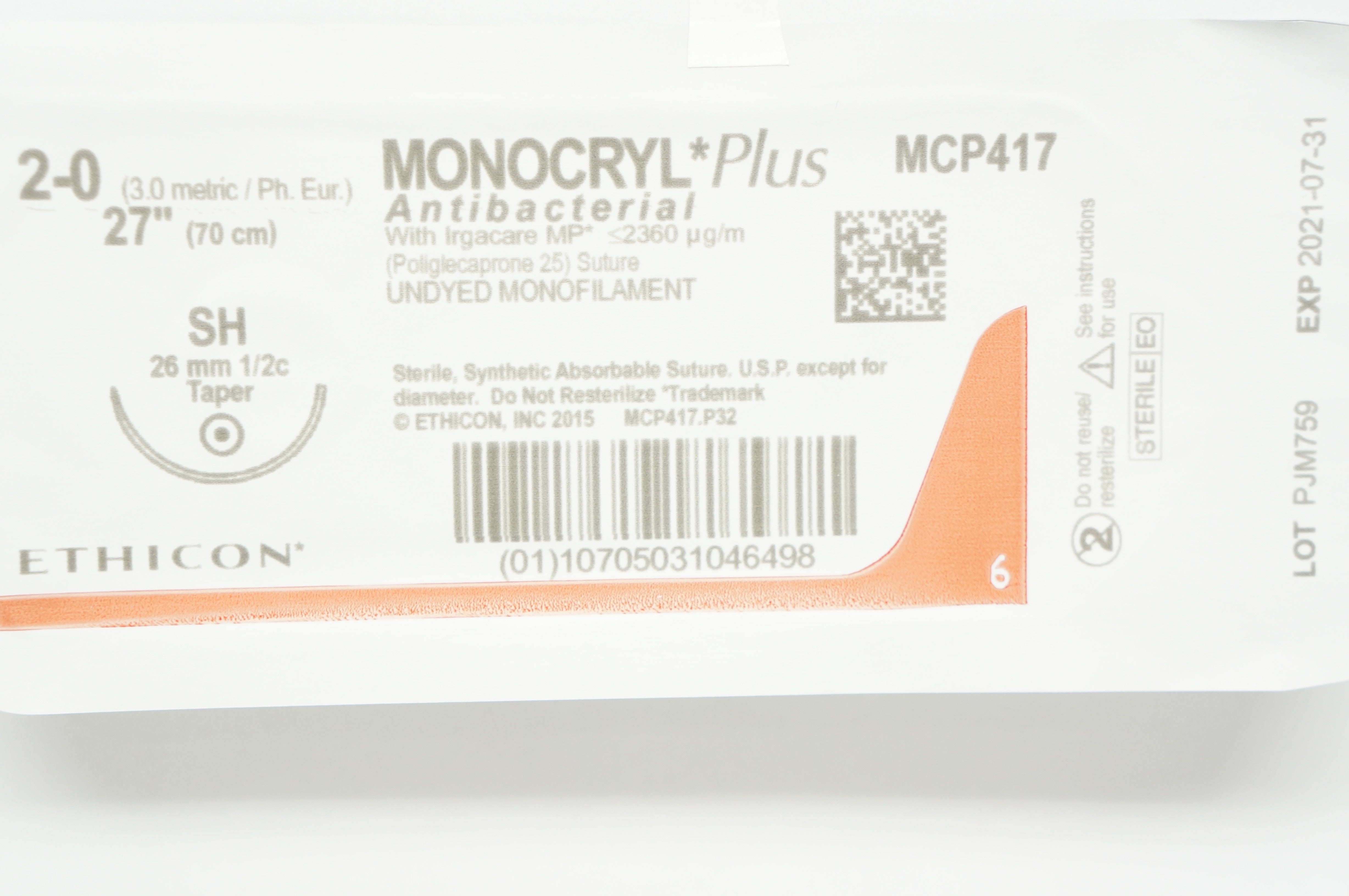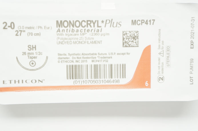 Ethicon MCP417 2-0 Monocryl Plus Stre SH 26mm 1/2c Taper 27inch (x)