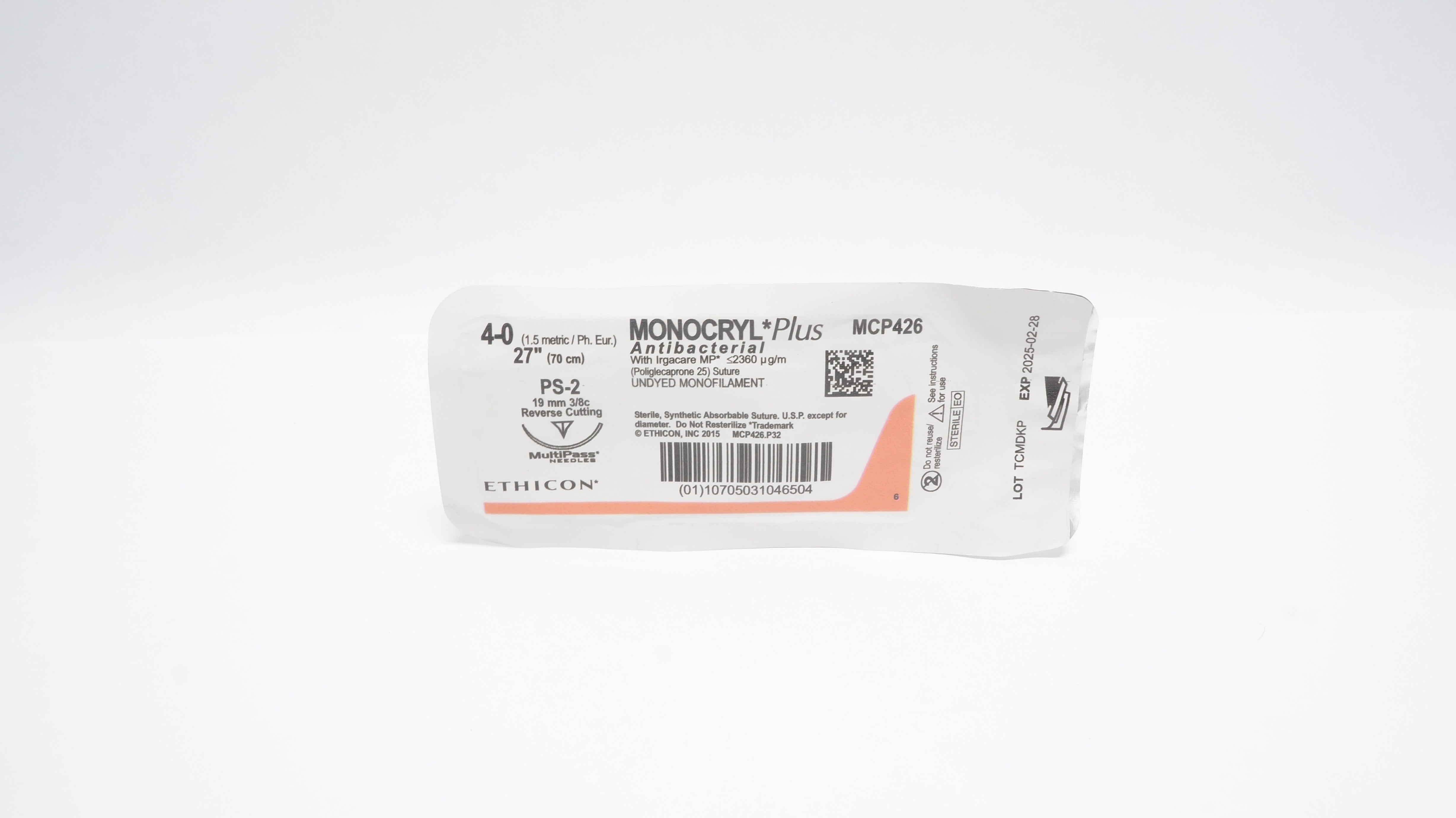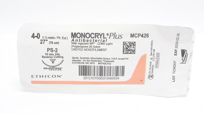 - Ethicon MCP426 4-0 MONOCRYL Plus Stre PS-2 19mm 3/8c Reverse Cutting, 27inch (x)