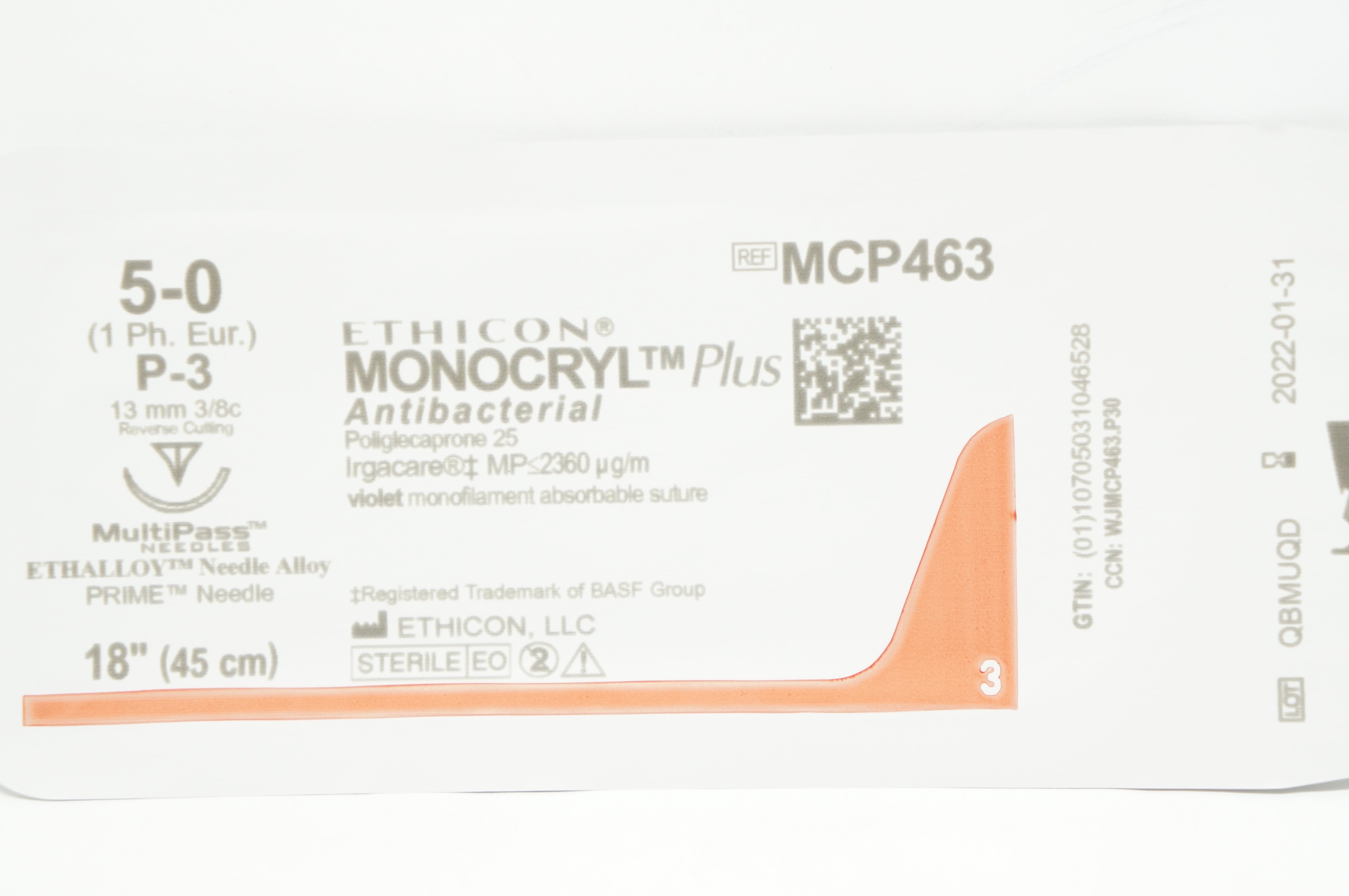 Ethicon MCP463 5-0 mMonocryl Plus Antibacterial Poliglecaprone 25 Suture Violet  Monofilament P-3 13mm 3/8c Reverse Cutting 18inch