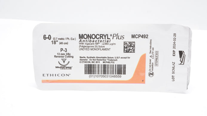 Ethicon MCP492 6-0 MONOCRYL Plus, P-3, 13mm 3/8c Reverse Cutting, 18inch (x)