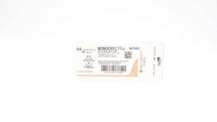 - Ethicon MCP492 6-0 MONOCRYL Plus, P-3, 13mm 3/8c Reverse Cutting, 18inch (x)