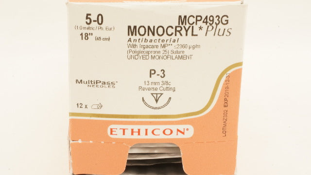 Ethicon MCP493G 5-0 MONOCRYL Plus Stre P-3 13mm 3/8c, 18inch (x) - Box of 12