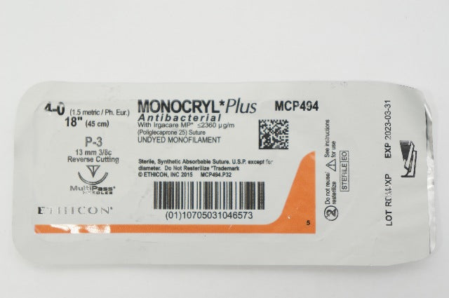 - Ethicon MCP494 4-0 MONOCRYL Plus, P-3, 13mm 3/8c Reverse Cutting, 18inch
