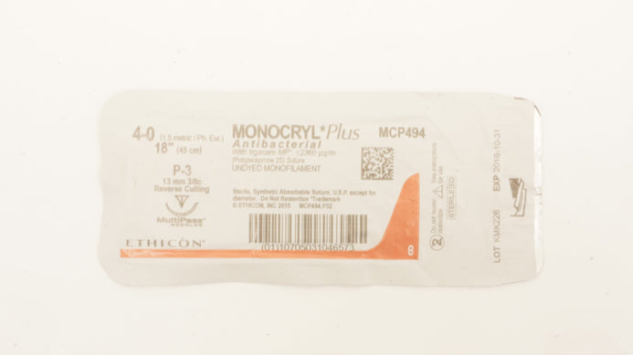 Ethicon MCP494 4-0 MONOCRYL Plus Stre P-3, 13mm 3/8c Reverse Cutting, 18inch (x)