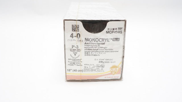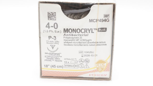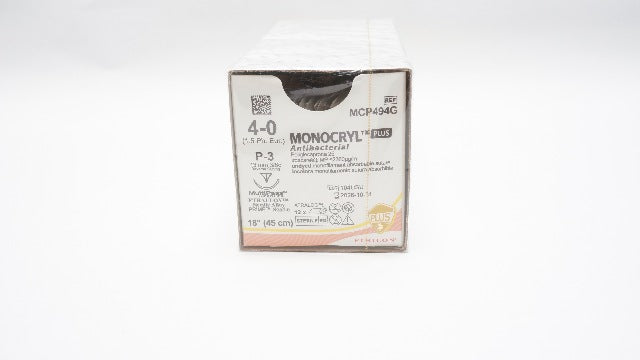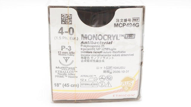 Ethicon MCP494G 4 MONOCRYL Plus Antibacterial Poliglecaprone 25 Suture Undyed Monofilament P-3 13mm 3/8c Reverse Cutting 18inch