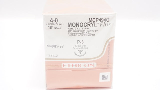 Ethicon MCP494G 4 MONOCRYL Plus Antibacterial Poliglecaprone 25 Suture Undyed Monofilament P-3 13mm 3/8c Reverse Cutting 18inch