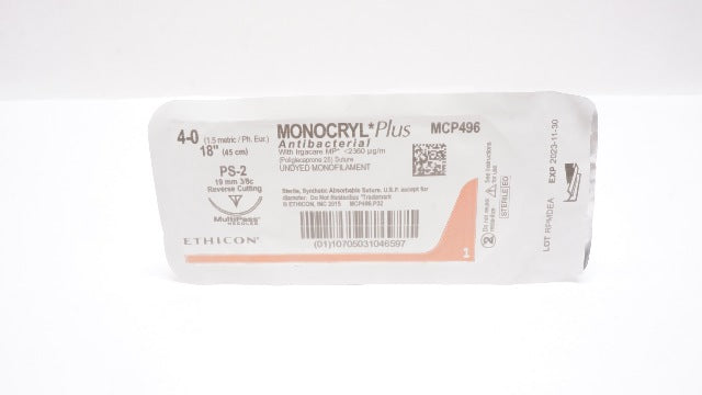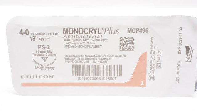 Ethicon MCP496 4-0 MONOCRYL Plus Stre PS-2 19mm 3/8c Reverse Cutting, 18inch
