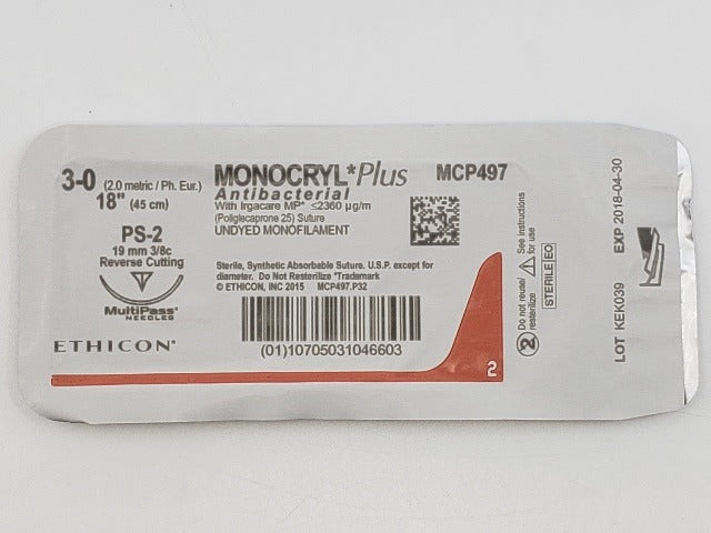 Ethicon MCP497 MONOCRYL, PS-2, 19mm 3/8c, 18in., Size 3-0