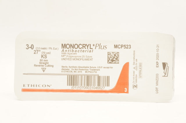 - Ethicon MCP523 3-0 MONOCRYL Plus Stre KS 60mm Straight Reverse Cutting 27in. (x)