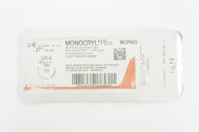 - Ethicon MCP605 2-0 MONOCRYL Plus, UR-6, 26mm 5/8c Taper, 27inch (x)
