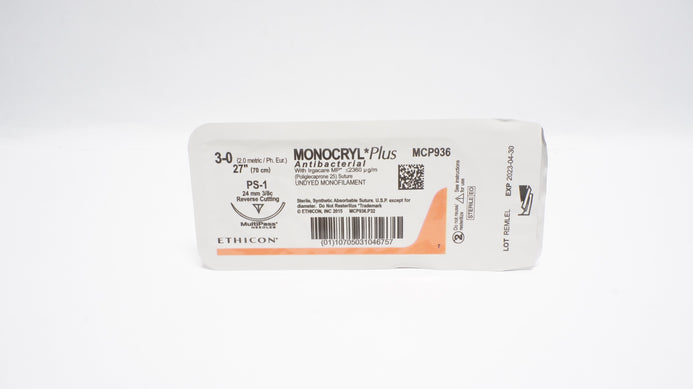- Ethicon MCP936 3-0 Monocryl Plus Stre PS-1 24mm 3/8c Reverse Cutting 27inch (x)