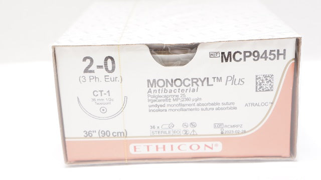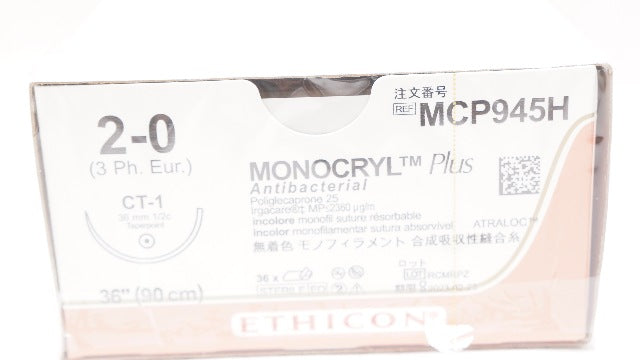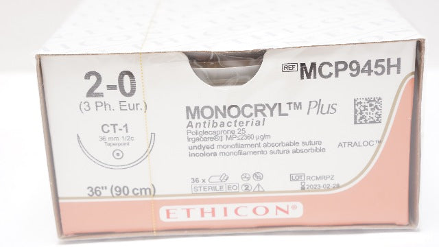 Ethicon MCP945H 2-0 Monocryl Plus Antibacterial Poliglecaprone 25 Undyed Monofilament Suture CT-1 36mm 1/2c Taperpoint 36inch