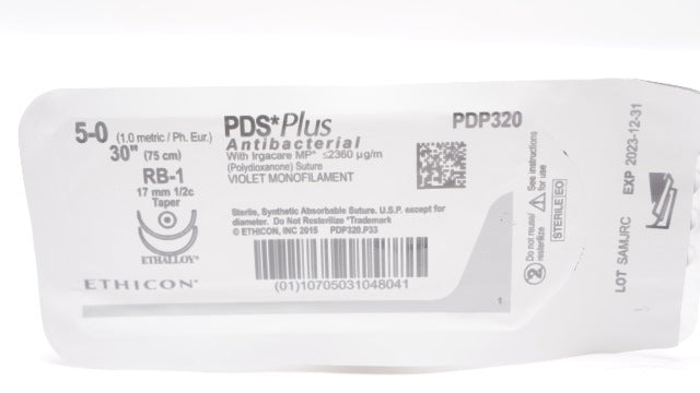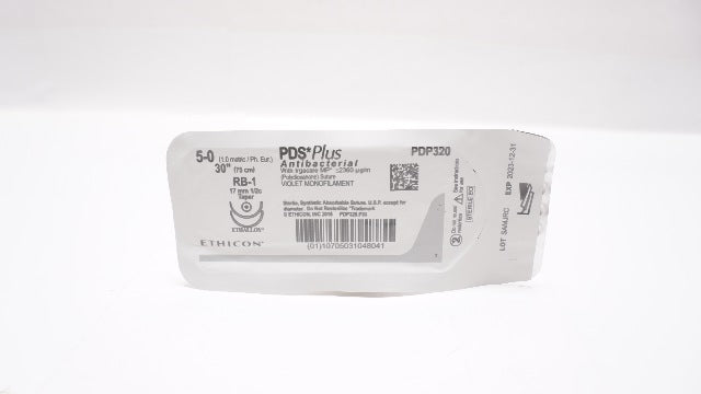 - Ethicon PDP320 5-0 PDS Plus Antibacterial Stre RB-1 17mm 1/2c Taper, 30inch (x)