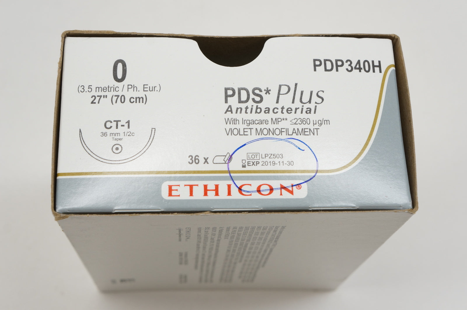 Ethicon PDP340H 0 PDS Plus Antibacterial, CT-1, 36mm 1/2c, 27in. (x) -Box of 32
