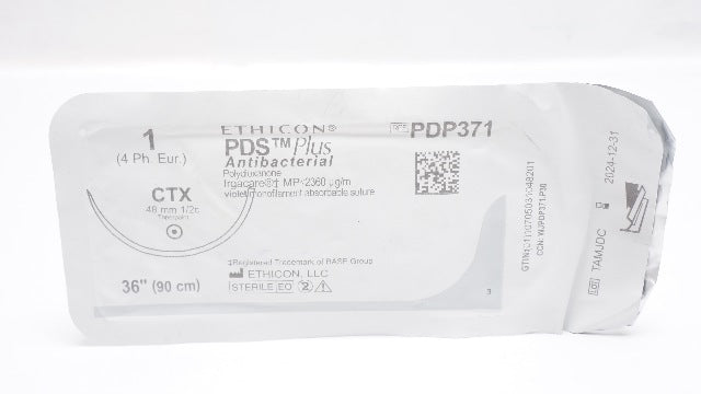 Ethicon PDP371 1 PDS Plus Antibacterial Polydioxanone Suture Violet Monofilament CTX 48mm 1/2c Taper, 36inch